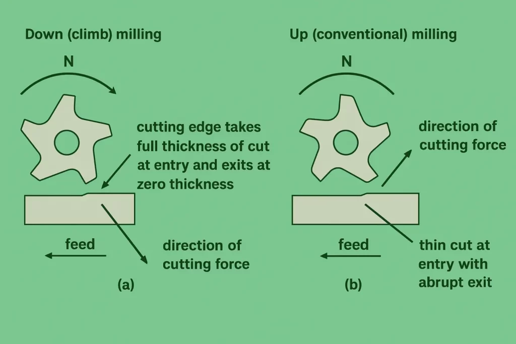 ¿Necesitas un acabado tipo espejo? Utiliza solo fresado en concordancia. ¿Un corte basto para preparación de soldadura? El fresado en oposición funciona bien. Las pasadas de acabado siempre se benefician del fresado en concordancia si tu máquina lo permite.